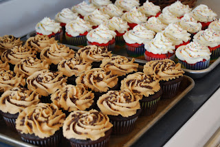 There’s a bake sale tonight at church. I decided to give the rainbow cupcakes another shot. Turns out if you follow the directions exactly and don’t have 13 tween girls helping you, they turn out awesome. I use this recipe from Pampered Chef for frosting, only I add a pinch or two of salt. The other cupcakes are chocolate with peanut butter frosting. I doctored a cake mix a la Amber: an extra egg, a box of pudding, and about 1/3 c of sour cream. The frosting is this one, but I followed the directions in the first review and (again) added a little salt. Maybe I’ll stop posting about cupcakes now?