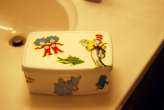 See that flushable wipes container on the tank? I covered it with stickers from the dollar section at Target and then did a couple coats of Mod Podge. I don’t LOVE it, but I think the idea has some potential.