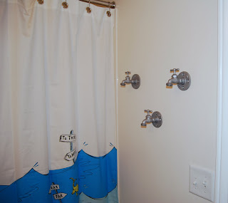 I gave the spigots and flanges (still giggling at both of those words) a couple of coats of spray paint and then mounted them directly to the wall. I hit a stud on the center one and used drywall anchors like these for the other two.